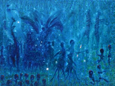 Again those little guys came into this piece that appear in the other pictures. They are like ants or some kind of bug. This time they look like observers and maybe they are children playing or a group of curious villagers watching these guys walk through the darkness that also have bug-like characteristics. They all look like they have personalities, when I look at them individually they all exhibit idiosyncrasies that give them each character.