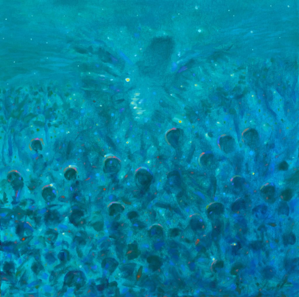 “The Visitation” is 36 x 36 acrylic on canvas. This is my third shot at channeling